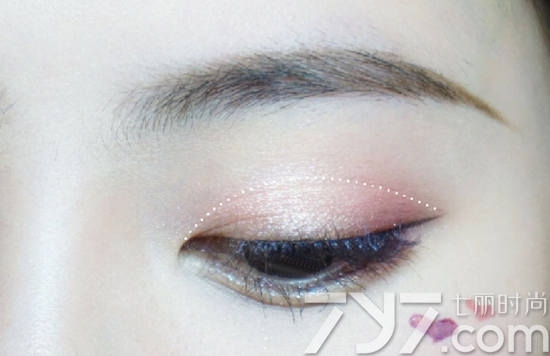 第一步:选择人鱼姬色眼影,铺满上眼皮,粉色珠光眼影都可以。