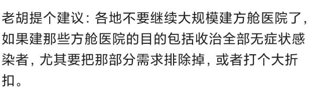 胡锡进今天发文,建议各地不要大规模建方舱医院,把建设方舱医院的钱用于建收治重症患者的医院,增加正规医院病床数量。