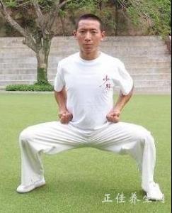 两腿平行开立, 两脚间距离三个脚掌的长度,然后下蹲,脚尖平行向前,勿外撇.两膝向外撑,膝盖不能超过脚尖,大腿与地面平行.同时胯向前内收,臀部勿突出.这样能使裆成圆弧形,俗称圆裆.含胸拔背,勿挺胸,胸要平,背要圆.两手可环抱胸前,如抱球状.虚灵顶劲,头往上顶,头顶如被一根线悬住. 两脚同肩宽或三脚半都可以.北少林的四平大马要求四脚距离,南拳有些门派要求窄马(脚同肩宽).宽马和窄马锻炼的部位有所区别,另外窄马的动作相对难些,特别是低窄马步.很容易产生厥臀,腆胸的毛病,动作不易标准.如果动作错了,当然无法增长功力,甚至可能出现伤害.初练时宜站大步,三脚或三脚半比较合适.